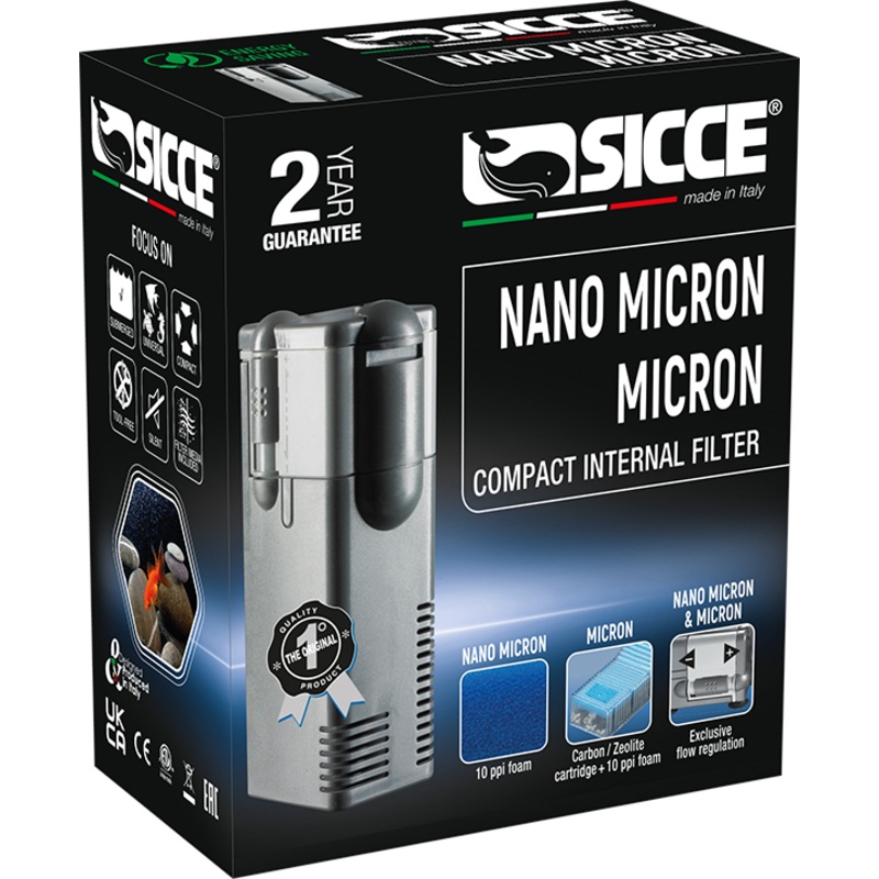 Sicce Micron Internal Filter - 300L/H (10-75L Tank) - 5WNANO MICRON and MICRON are internal filters for starter kits, turtle kits and small aquariums. They are integrated with an antiwear device and an exclusive water flow control system which allows filte
